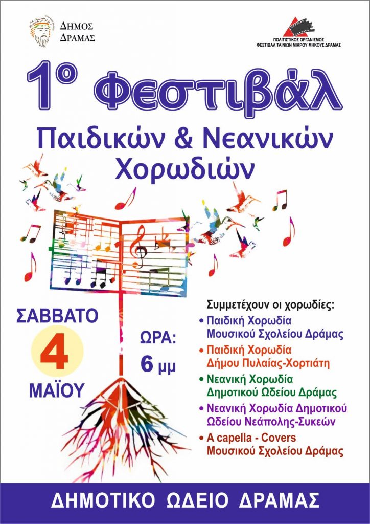 Το Σαββατο 4 Μαιίου στις 6.00 μ.μ.μ στο Δημοτικό Ωδείο Δράμας ο Δήμος Δράμας και ο Πολιτιστικός Οργανισμός Φεστιβάλ Ταινιών Μικρού Μήκους, διοργανώνουν το 1ο Φεστιβάλ Παιδικών και Νεανικών Χορωδιών, με την συμμετοχή των χορωδιών 1. Παιδική χορωδία Μουσικού Σχολείου Δράμας 2.Παιδική χορωδία Δήμου Πυλαίας Χορτιάτη 3.Νεανική χορωδία Δημοτικού Ωδείου Δράμας 4. Νεανική χορωδία Δημοτικού Ωδείου Νεάπολης Συκεών  5. A cappela – Coveres Μουσικού Σχολείου Δράμας.