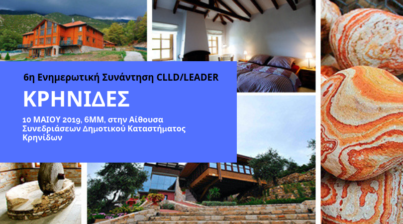 Σε ενημέρωση την Παρασκευή 10 Μαίου 2018 και ώρα 18:00 στην Αίθουσα συνεδριάσεων του Δημοτικού Καταστήματος Κρηνίδων, καλεί η Αναπτυξιακή Καβάλας – Αναπτυξιακή Ανώνυμη Εταιρεία ΟΤΑ τους υποψήφιους δικαιούχους οι οποίοι ενδιαφέρονται να υποβάλλουν αιτήσεις στήριξης στην Πρόσκληση υποβολής προτάσεων πράξεων Ιδιωτικού Χαρακτήρα του Τοπικού Προγράμματος CLLD/LEADER Νομού Καβάλας.