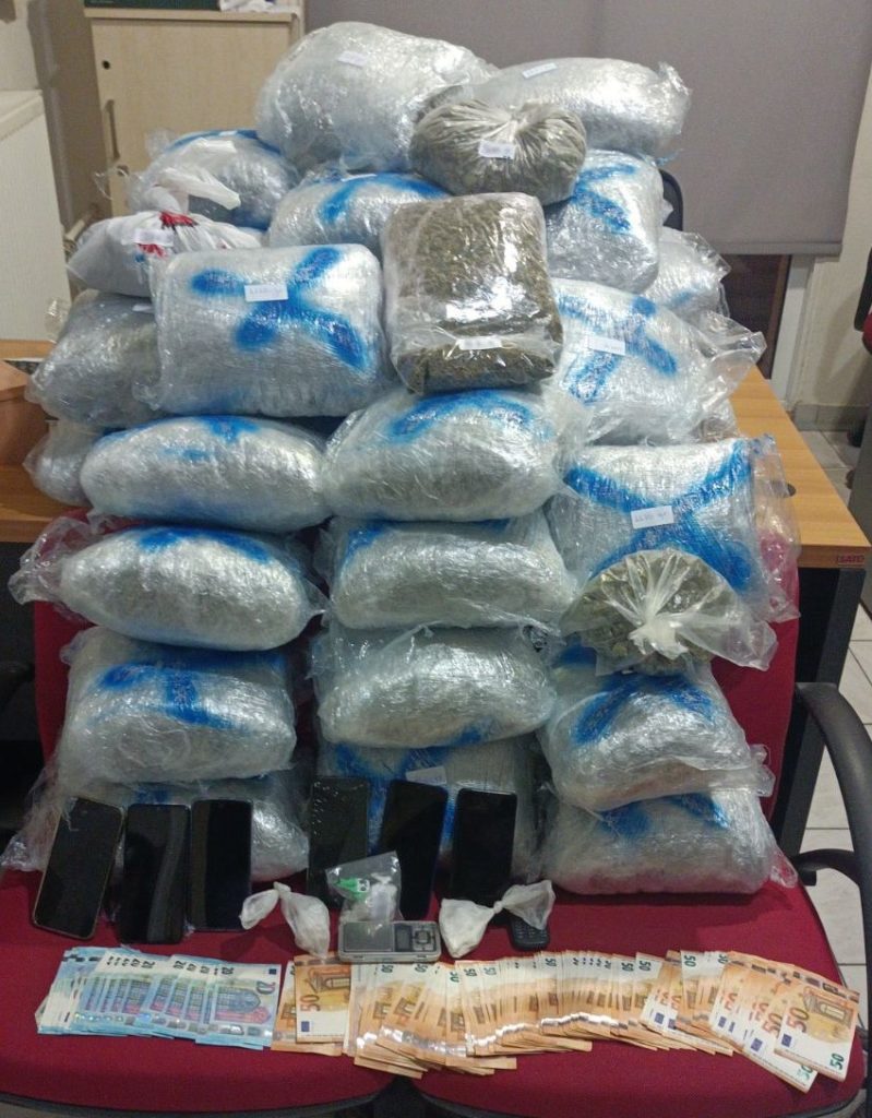 Κατασχέθηκαν συνολικά 43 κιλά και 854,1 γραμμάρια ακατέργαστης κάνναβης, 123,2 γραμμάρια κοκαΐνης, 1 ηλεκτρονική ζυγαριά ακριβείας, το όχημα που χρησιμοποίησαν οι δράστες ως μέσο μεταφοράς των ναρκωτικών, το χρηματικό ποσό των 4.675 ευρώ και κινητά τηλέφωνα.