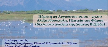 Δημοσιεύθηκε στις 23 Αυγούστου 2012 | Χωρίς σχόλια.Την Πέμπτη 23 Αυγούστου, ο Φορέας Διαχείρισης Εθνικού Πάρκου Δέλτα Έβρου, με την υποστήριξη του Δήμου Αλεξανδρούπολης διοργανώνει ενημερωτική – εκπαιδευτική εκδήλωση, στην πλατεία του Φάρου, στην Αλεξανδρούπολη. Σκοπός της εκδήλωσης είναι η γνωριμία των κατοίκων της πόλης με το σπουδαίο υγροβιότοπο που βρίσκεται μόλις […] -