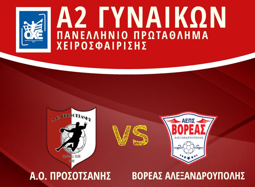 Tην  Κυριακή 22 Ιανουαρίου 2023 στις 16:00 στο Κλειστό Γυμναστήριο Προσοτσάνης “ΓΕΏΡΓΙΟΣ ΜΑΚΡΗΣ” θα διεξαχθεί ο αγώνας Α.Ο. ΠΡΟΣΟΤΣΑΝΗΣ – ΒΟΡΕΑΣ ΑΛΕΞΑΝΔΡΟΥΠΟΛΗΣ, στο πλαίσιο του Πανελλήνιου Πρωταθλήματος Χειροσφαίρισης της Α2 ΓυναικώνΑμέσως μετά τον πολύ σημαντικό αγώνα των Γυναικών για την Α2 τη σειρά παίρνουν τα τμήματα υποδομής για τα ηλικιακά Πρωταθλήματα της Ε.Σ.Χ.Α.ΜΑ.Θ.!