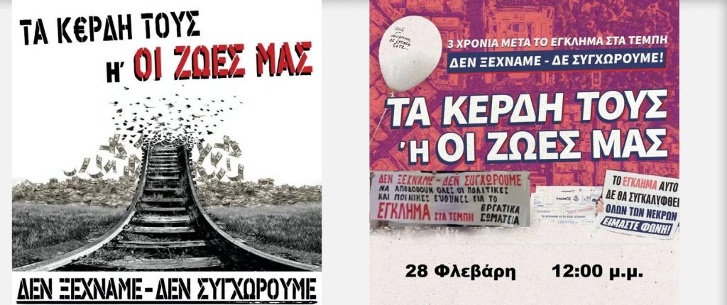 Σε αγωνιστικούς ρυθμούς βρίσκονται συνδικάτα, εργατικά σωματεία και μαζικοί φορείς σε όλη τη χώρα για τις μεγάλες συγκεντρώσεις το Σάββατο 28 Φεβρουαρίου 2026, μέρα που συμπληρώνονται 3 χρόνια από το έγκλημα στα Τέμπη. Με σύνθημα «Δεν ξεχνάμε – Δεν συγχωρούμε – Τα κέρδη τους ή οι ζωές μας», στο στόχαστρο της πάλης μπαίνει η εγκληματική πολιτική του κέρδους, που γεννά τέτοιες αμέτρητες κοιλάδες θανάτου σε χώρους δουλειάς και γειτονιές.