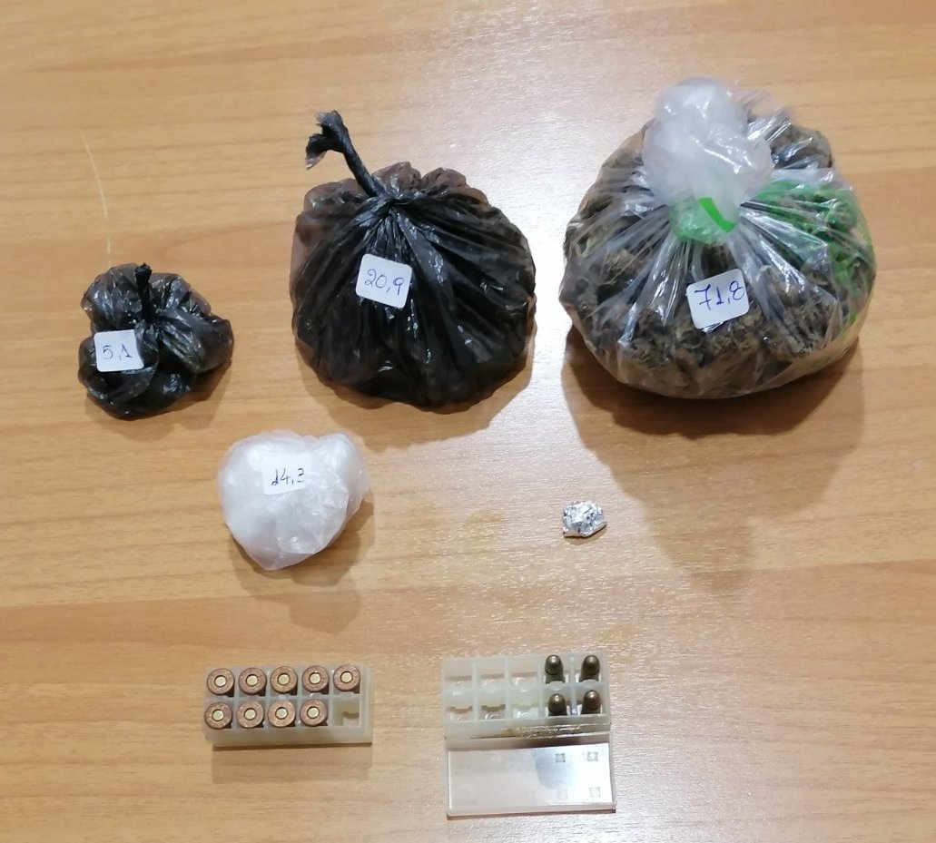 • από την οικία του αλλοδαπού, μια νάιλον συσκευασία με ακατέργαστη κάνναβη βάρους 71,8 γραμμαρίων, μια νάιλον συσκευασία με κοκαΐνη βάρους 14,3 γραμμαρίων και 13 φυσίγγια.