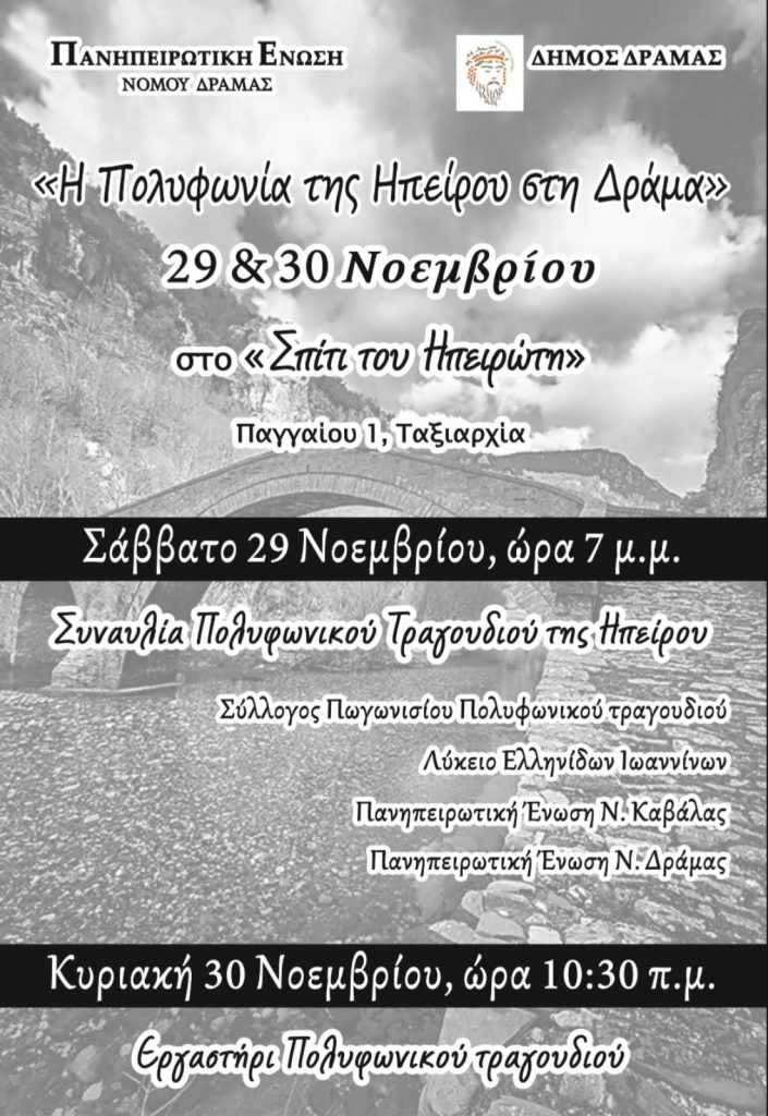 Η Πανηπειρωτική Ένωση Ν. Δράμας σάς καλεί να τιμήσετε με την παρουσία σας τις εκδηλώσεις για το πολυφωνικό ηπειρώτικο τραγούδι με τίτλο: