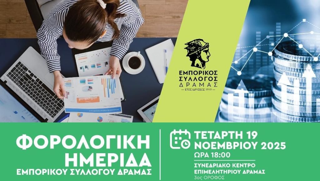 Ο Εμπορικός Σύλλογος Δράμας διοργανώνει Φορολογική Ημερίδα, η οποία θα πραγματοποιηθεί την Τετάρτη 19 Νοεμβρίου 2025, στις 18:00, στο Συνεδριακό Κέντρο του Επιμελητηρίου Δράμας (3ος όροφος).