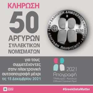 Σε ένδειξη εκτίμησης της μεγάλης συμμετοχής των πολιτών στη διαδικασία της ηλεκτρονικής αυτοαπογραφής, θα κληρωθούν πενήντα (50) συλλεκτικά νομίσματα της «Απογραφής Πληθυσμού -Κατοικιών» μεταξύ όσων απογραφούν ηλεκτρονικά. Αναλυτικά οι όροι της κλήρωσης στην ιστοσελίδα της ΕΛΣΤΑΤ: www.statistics.gr.