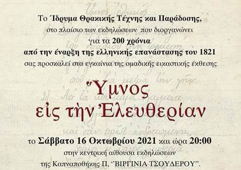 Το Ίδρυμα Θρακικής Τέχνης και Παράδοσης, στο πλαίσιο των εκδηλώσεών του για τα 200 χρόνια από την έναρξη της Ελληνικής Επανάστασης, διοργανώνει μια συλλογική εικαστική «ανάγνωση» του «Ύμνου Εις την Ελευθερίαν» του Διονυσίου Σολωμού.