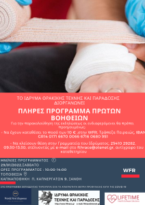 Το Ίδρυμα Θρακικής Τέχνης και Παράδοσης σε συνεργασία με τον εκπαιδευτικό οργανισμό παροχής Α’ Βοηθειών «World First ResponseWFR»  και την Ομάδα Lifetime HSS, διοργανώνει το Σάββατο 29 Ιανουαρίου 2022, από τις 10:00 ως τις 14:00, σεμινάριο εκπαιδεύσεως εθελοντών στις Α’ Βοήθειες, εν όψει της καλοκαιρινής περιόδου.