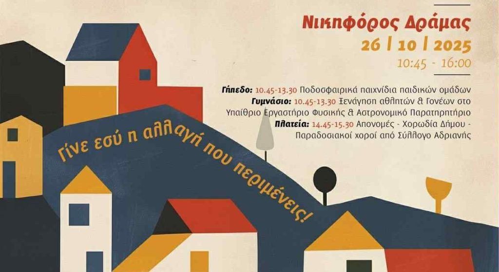 Ο Δήμος Παρανεστίου μαζί με την Ακαδημία Ποδοσφαίρου Βόρειοι Δράμας – Κεραυνός Μοναστηρακίου, με τον Μορφωτικό Πολιτιστικό Σύλλογο Αδριανής και τον Θεατρικό Μουσικοχορευτικό Σύλλογο Παρανεστίου διοργανώνει εκδήλωση με τίτλο «Με το ποδόσφαιρο ζωντανεύουν τα χωριά» την Κυριακή 26/10/2025 και ώρα 10:45 – 16:00. Μία δράση για μικρούς και μεγάλους με σκοπό την προώθηση του αθλητισμού, της ιστορίας και του πολιτισμού του τόπου μας.