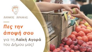 Ο Δήμος Δράμας  καλεί όλους τους πολίτες να συμμετέχουν στη διαδικτυακή διαβούλευση για τη λειτουργία της Λαϊκής Αγοράς, καταθέτοντας τις απόψεις και τις προτάσεις τους, με στόχο τη βελτίωση των παρεχόμενων υπηρεσιών από τη Λαϊκή Αγορά.
