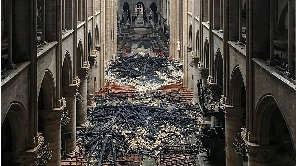 Ο μαυρισμένος «σκελετός» του ναού, με μεγάλα τμήματά του να έχουν αφανιστεί, αποτελεί μια θλιβερή υπενθύμιση ότι κανένα ανθρώπινο έργο, όσο μεγαλειώδες κι αν είναι, δεν είναι άτρωτο απέναντι στην σαρωτική δύναμη της φωτιάς.