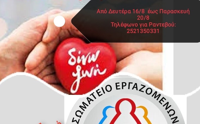 Το Σωματείο Εργαζομένων Γ.Ν Δράμας ,, διοργανώνει εθελοντικής αιμοδοσίας την Δευτέρα 16/8 εως Παρασκευή 20/8 (από 8 π.μ ως 13μ.μ) στο τμήμα αιμοδοσίας του Νοσοκομείου Δράμας.