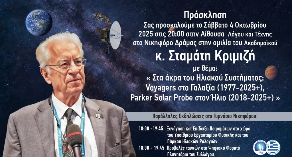 Ο Δήμος Παρανεστίου σε συνεργασία με το Σύλλογο Ερασιτεχνικής Αστρονομίας Δράμας «ο Πήγασος» και το Γυμνάσιο με Λυκειακές Τάξεις Νικηφόρου συνδιοργανώνουν εκδήλωση με κεντρικό ομιλητή τον κ. Κριμιζή Σταμάτη, το Σάββατο 4 Οκτωβρίου 2025 και ώρα 20:00 στον Αίθουσα Λόγου και Τέχνης στο Νικηφόρο Δράμας (αύλιος χώρος Δημοτικού Σχολείου Νικηφόρου). Θέμα της ομιλίας θα είναι «Στα άκρα του Ηλιακού Συστήματος – Voyagers στο Γαλαξία (1977-2025+) Parker Solar Prob στον Ήλιο (2018-2025+)».