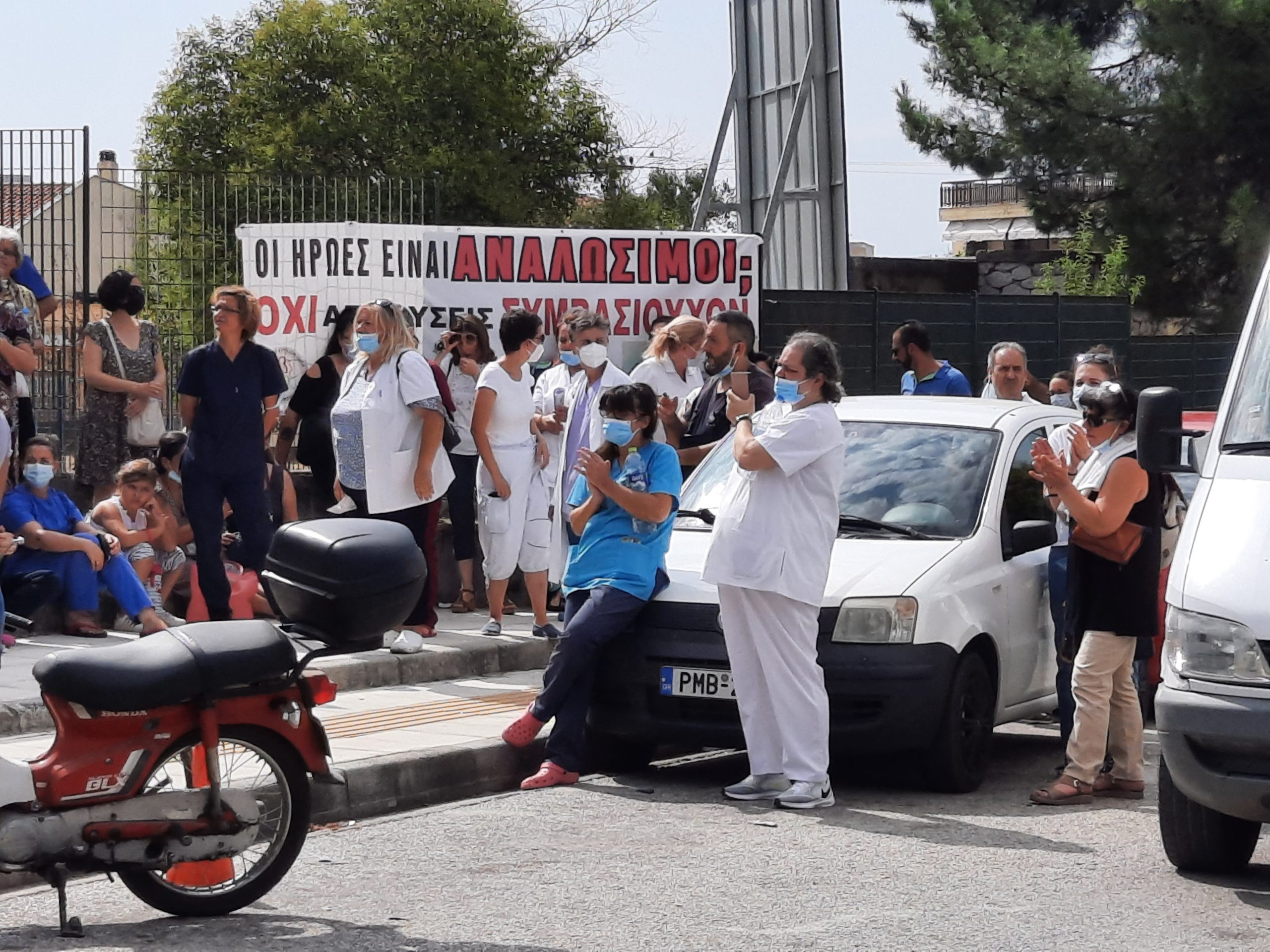 Οι εργαζόμενοι –εμβολιασμένοι στην πλειονότητά τους- πραγματοποίησαν στάση εργασίας και συγκέντρωση στην πύλη του Νοσοκομείου, όπου διατράνωσαν την θέση τους να στηρίξουν, όσους δεν επιθυμούν να κάνουν το εμβόλιο, και να μην επιτρέψουν την απόλυσή τους.