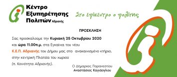 Δημοσιεύθηκε στις 20 Οκτωβρίου 2020 | Χωρίς σχόλια.Ένα όνειρο για τους κατοίκους της Αδριανής γίνεται πραγματικότητα με την ίδρυση και λειτουργία ενός Κέντρου Εξυπηρέτησης Πολιτών, το οποίο και εγκαινιάζεται την προσεχή Κυριακή 25 Οκτωβρίου. Σημειώνεται ότι το κόστος ανέλαβε ο Δήμος Παρανεστίου και η στελέχωση θα γίνει με προσωπικό από άλλες υπηρεσίες […] -