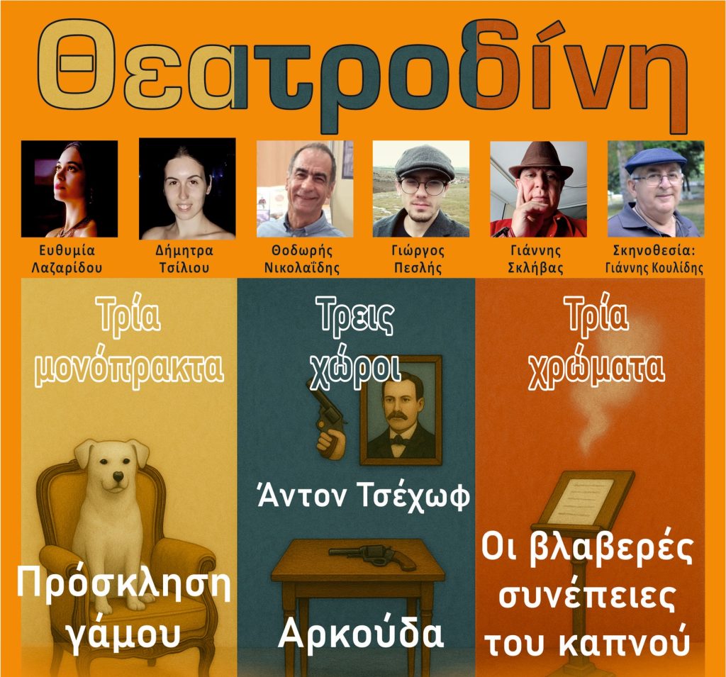 Ο Πολιτιστικός Σύλλογος “Το Κλειδί για τον Πολιτισμό και την Ανάπτυξη στο Νομό Δράμας” έχει σκοπό τη διάσωση και ανάδειξη της ιστορίας, του πολιτισμού, τη διάσωση και διάδοση της πο- λιτιστικής και γαστρονομικής κληρονομιάς του τόπου μας, με τη διενέργεια εκδηλώσεων με στόχο την πολιτιστική και οικονομική ανάπτυξη της περιοχής, με τη θεατρική του ομάδα Θεατροδίνη πα- ρουσιάζει μια παράσταση αφιερωμένη στο έργο του μεγάλου Ρώσου δραματουργού Anton Chekhov, μέσα από τρία από τα πιο χαρακτηριστικά και αγαπημένα μονόπρακτά του.