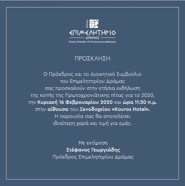 Εκδήλωση πραγματοποιεί το Επιμελητήριο Δράμας την Κυριακή 16 Φεβρουαρίου 2020 και ώρα 11.30 π.μ. στην αίθουσα του ξενοδοχείου <<Kouros Hotel>>.