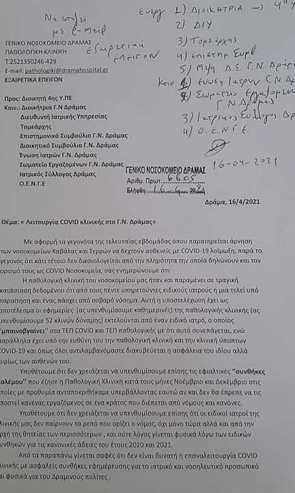 Ένα ιδιαιτέρως σοβαρό ζήτημα θέτουν οι γιατροί της Παθολογικής Κλινικής του Νοσοκομείου Δράμας. Το ζήτημα της νοσηλείας ασθενών με covid-19 οι οποίοι μέχρι τώρα νοσηλεύονταν -όπως όρισαν οι αρμόδιοι -στο Νοσοκομείο Καβάλας.